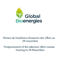 The Commercial Court of Evry has postponed the review of takeover offers for Global Bioenergies to 24 November 2025. This decision follows a hearing held on 3 November 2025.